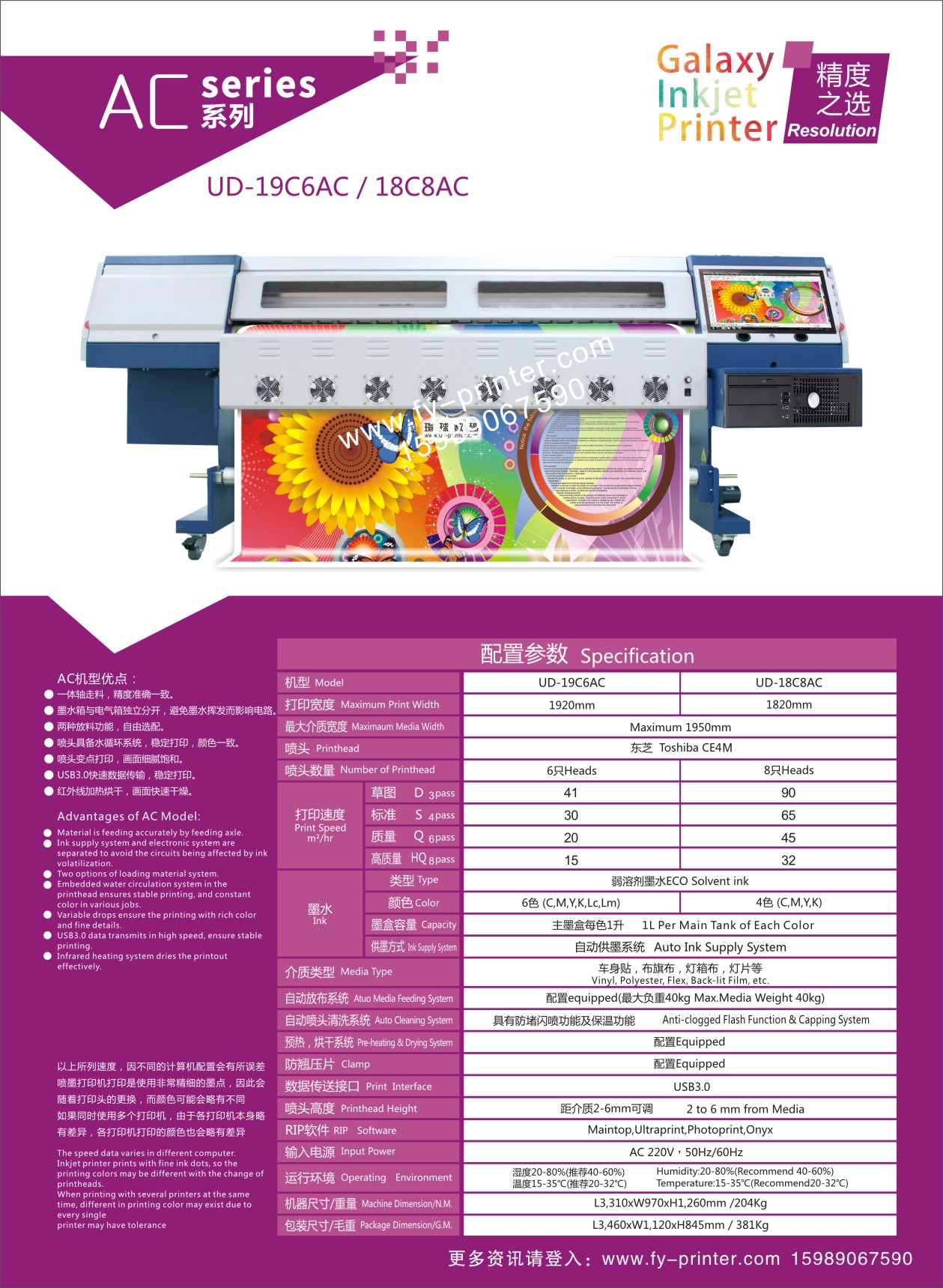 AC机型优点:1、一体轴走料,精度准确一致 2、墨水箱与电气箱独立分开,避免墨水挥发而影响电路 3、两种放料功能,自由选配 4、喷头具备水循环系统,稳定打印,颜色一致 5、喷头变点打印,画面细腻饱和 6、USB3.0快速数据传输,稳定打印 7、红外线加热烘干,画面快速干燥